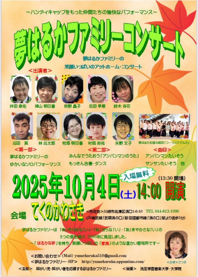 みなさま、お待たせいたしました! 今年も夢はるかファミリーのコンサートを開催いたします! ぜひ会場に足をお運びいただき、ご声援をお願いいたします!! 日時: 2025.10.4. (土) 14時開演 (13時30分開場) 会場: てくのかわさき <入場無料> [住所] 川崎市高津区溝口1-6-10 [アクセス] JR南武線「武蔵溝の口」駅下車 田園都市線「溝の口」駅下車 徒歩5分 <演奏曲目> あんぱんまんたいそう/さんさんたいそう 他 <出演> 夢はるかファミリー さつき(主宰)、小林真希(ピアノ)、 横尾 英志(ピアノ・歌)、川口 宏貴(ギター・歌) 夢はるか支援合唱団 コーラスさざんか 友情出演 : 上作グレート・ティーチャーズ・バンド <お問合せ> MAIL yumeharyka510@gmil.com <主催>夢はるかファミリー <後援>洗足学園音楽大学・大学院 <ピアノ指導>知野 好恵・井元 直美・八木 敦子・さつき <協力> 夢はるかファミリー保護者会 <夢はるかサポーターズ>(洗足学園音楽大学 卒業生・学生) 横尾 英志・安井 円香・川口 宏貴・伊藤 遼祐 <主宰・企画・指導> さつき |